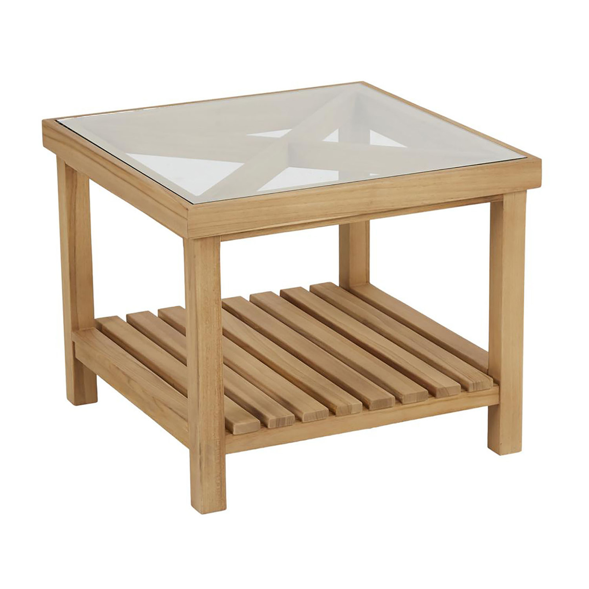 Soffborden i Varm serien har ett stativ förstklassig teak och en skiva av klart säkerhetsglas, över en ribbad hylla.